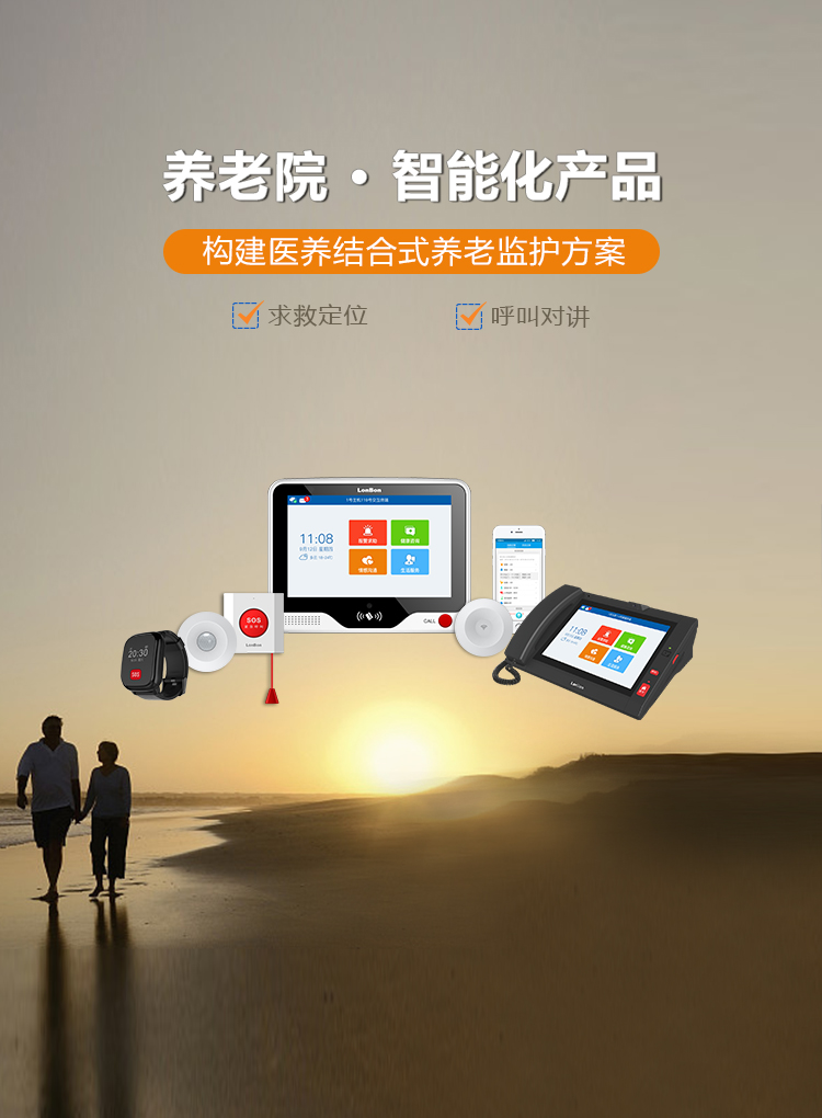 整合養老五大功能模塊,含求救定位、環境監測、護理對講、情感溝通、訪客對講,為養老院和社區居家場所提供智能一體化解決方案。